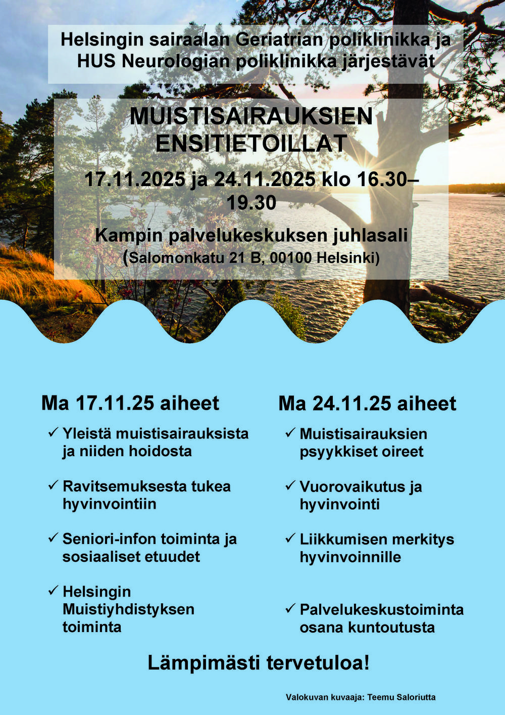 Tule mukaan kokemaan luonnon virkistävä vaikutus! Lievästi muistisairastuneille sekä heidän läheisilleen suunnattua ryhmätoimintaa. Luontoryhmä kokoontuu kerran kuukaudessa yhteisen retken merkeissä.…